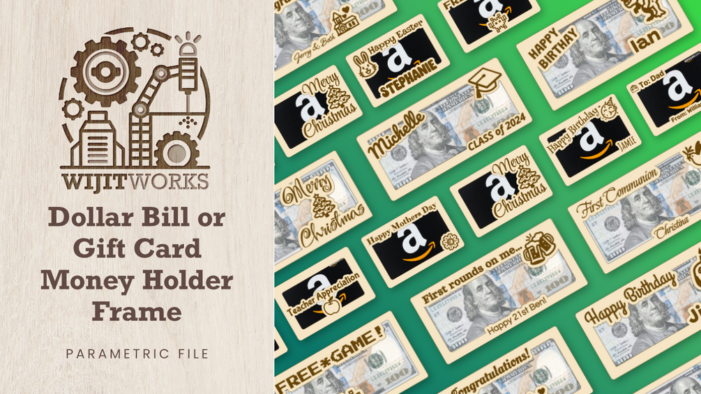 With customizable text, emoji clip art, and the ability to adjust dimensions for either a gift card or dollar bill, this file simplifies the process of creating a unique and practical gift. The included spacer ensures a snug fit for your chosen currency, while the backer adds stability and a polished finish to your frame.